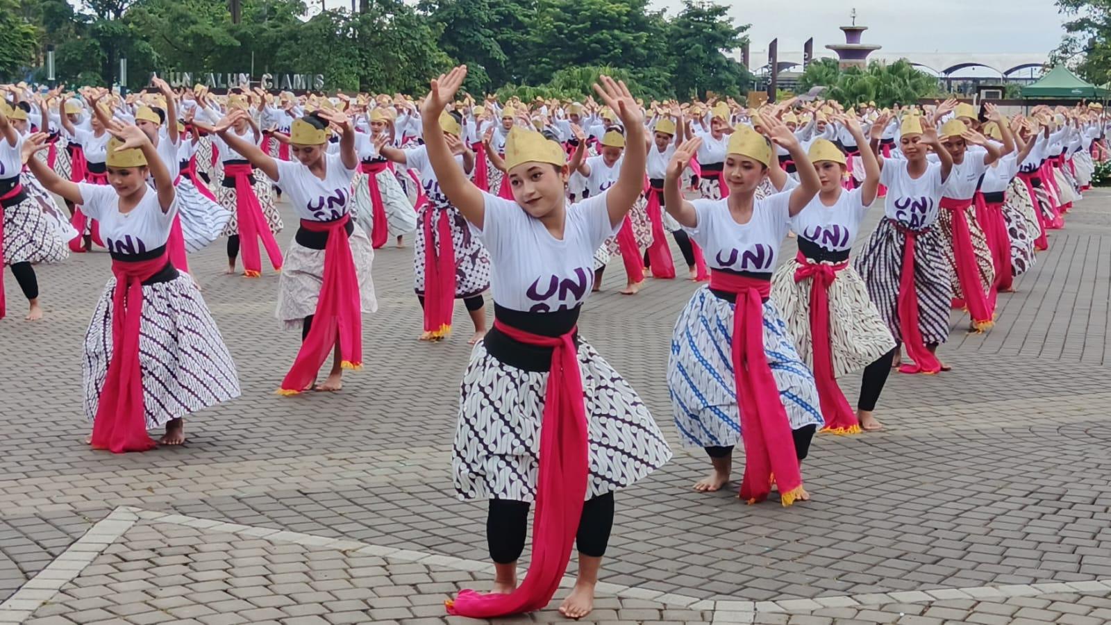 Sebanyak 517 pelajar dan mahasiswa di Kabupaten Ciamis memeriahkan Festival Konservasi dan Budaya Universitas Galuh (Unigal) lewat penampilan Tari Kolosal Jaipong Galuh Rahayu di Alun-Alun Ciamis, Selasa (28/10/2025).